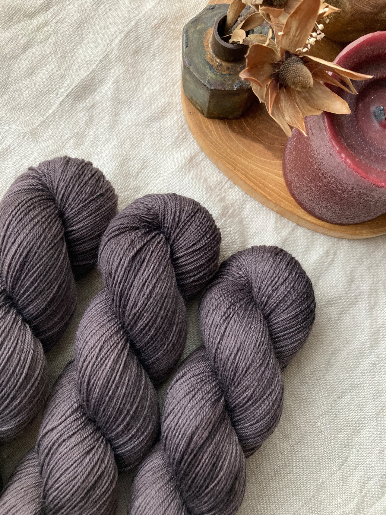 炭みたいな、墨みたいな。うすいブラックのような、濃いグレーのような。ブラウンも入れているので、ほんのり暖かみも。ダークカラーを編むのは結構大変ですが、こちらは適度な暗さなのでまだ編みやすいですよ。クール系がお好きな方におすすめです!