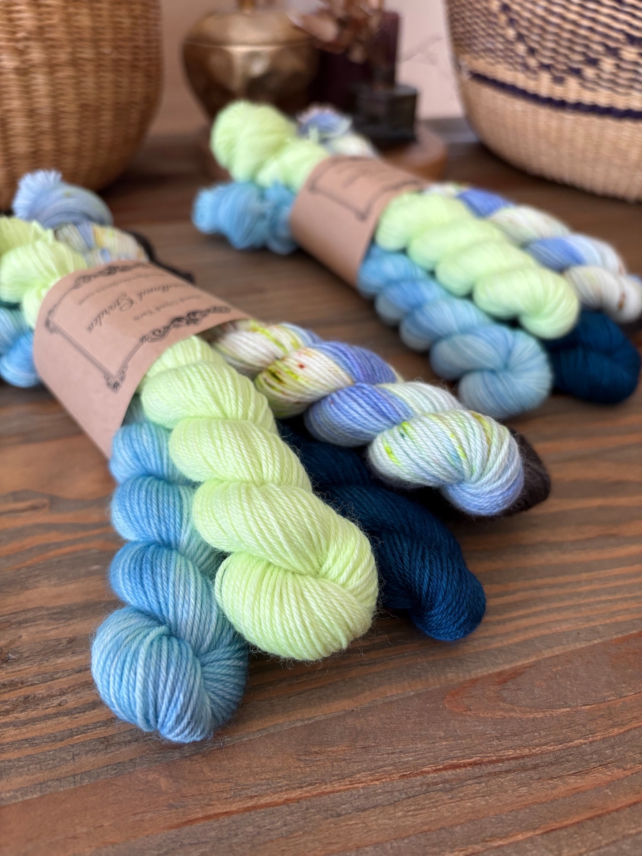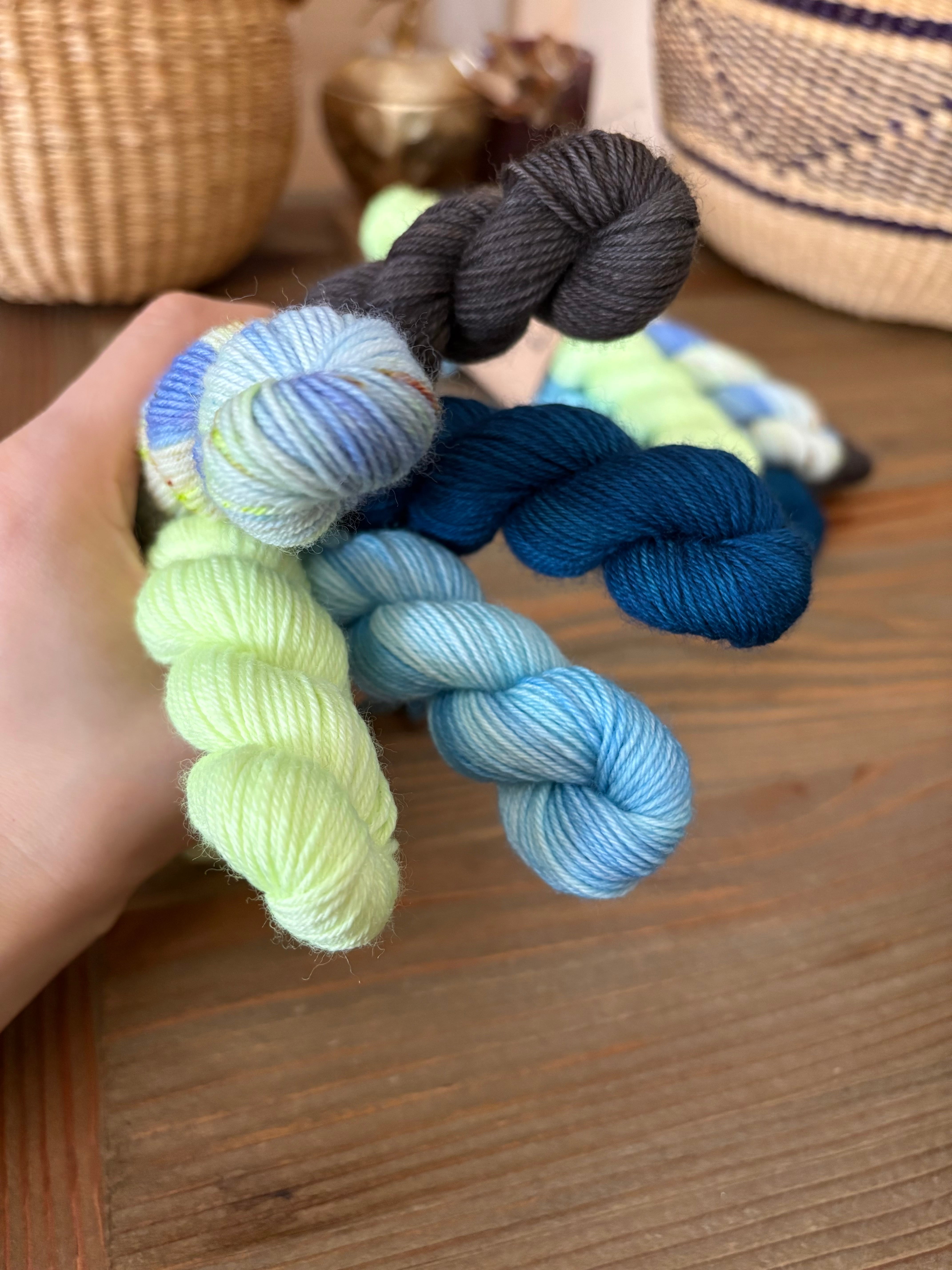アストロノミー=天文学。宇宙のロマンとか好きなんです。宇宙空間や隕石、素粒子…いろいろなものから想像して染めた宇宙っぽいお色たちのセットです。絶妙なトーンのネオンイエローグリーンがポイント♪