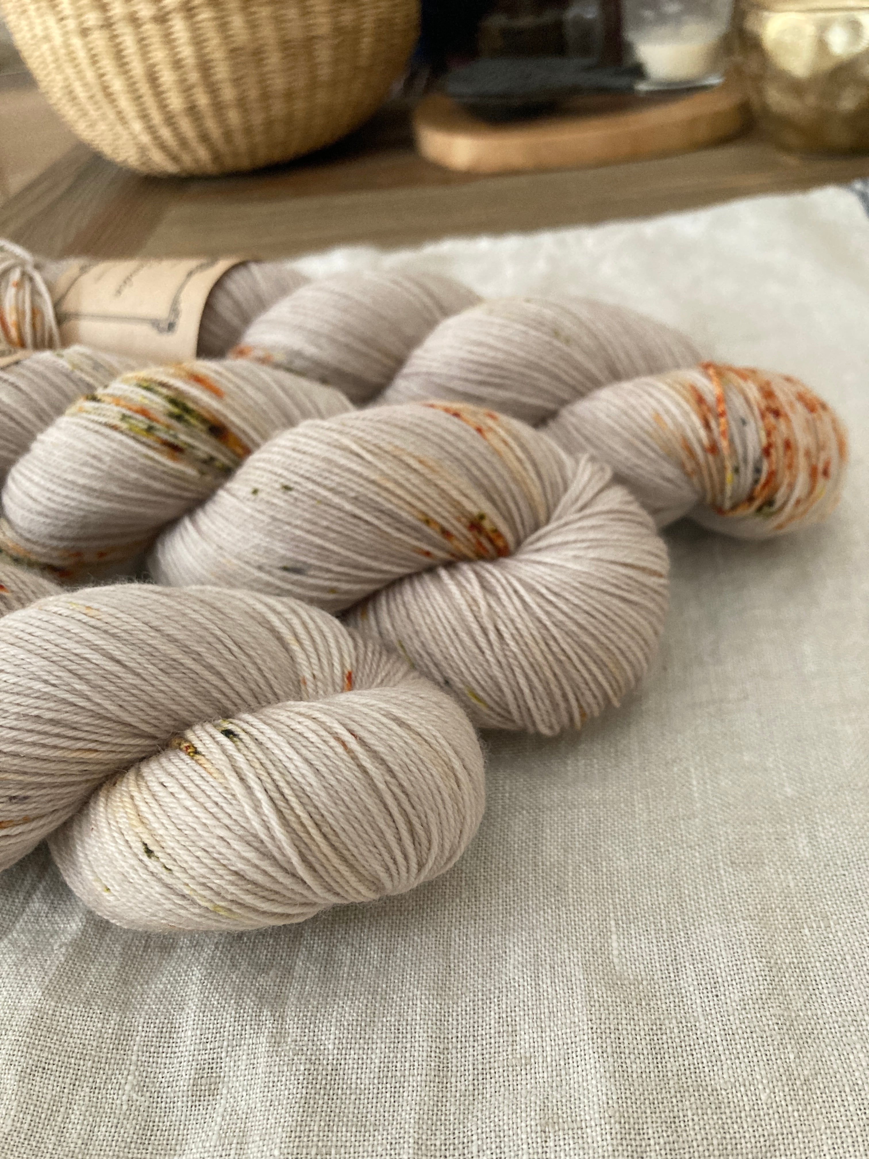 ごく淡いグレージュベースにオレンジとカーキっぽいグリーンのスペックル。カレンデュラの花びらと葉を散りばめたようなお色で、どことなくノスタルジックな雰囲気を感じます。