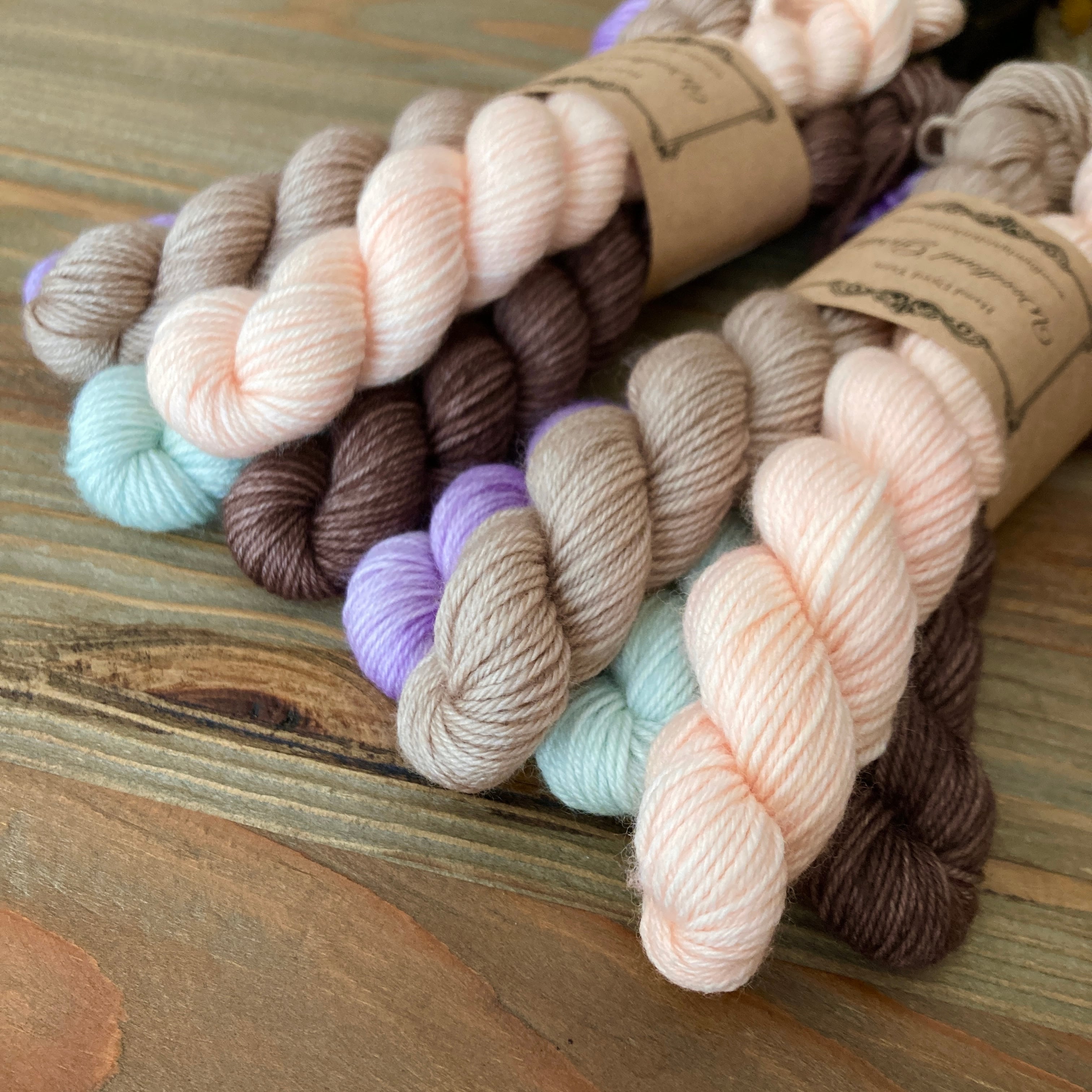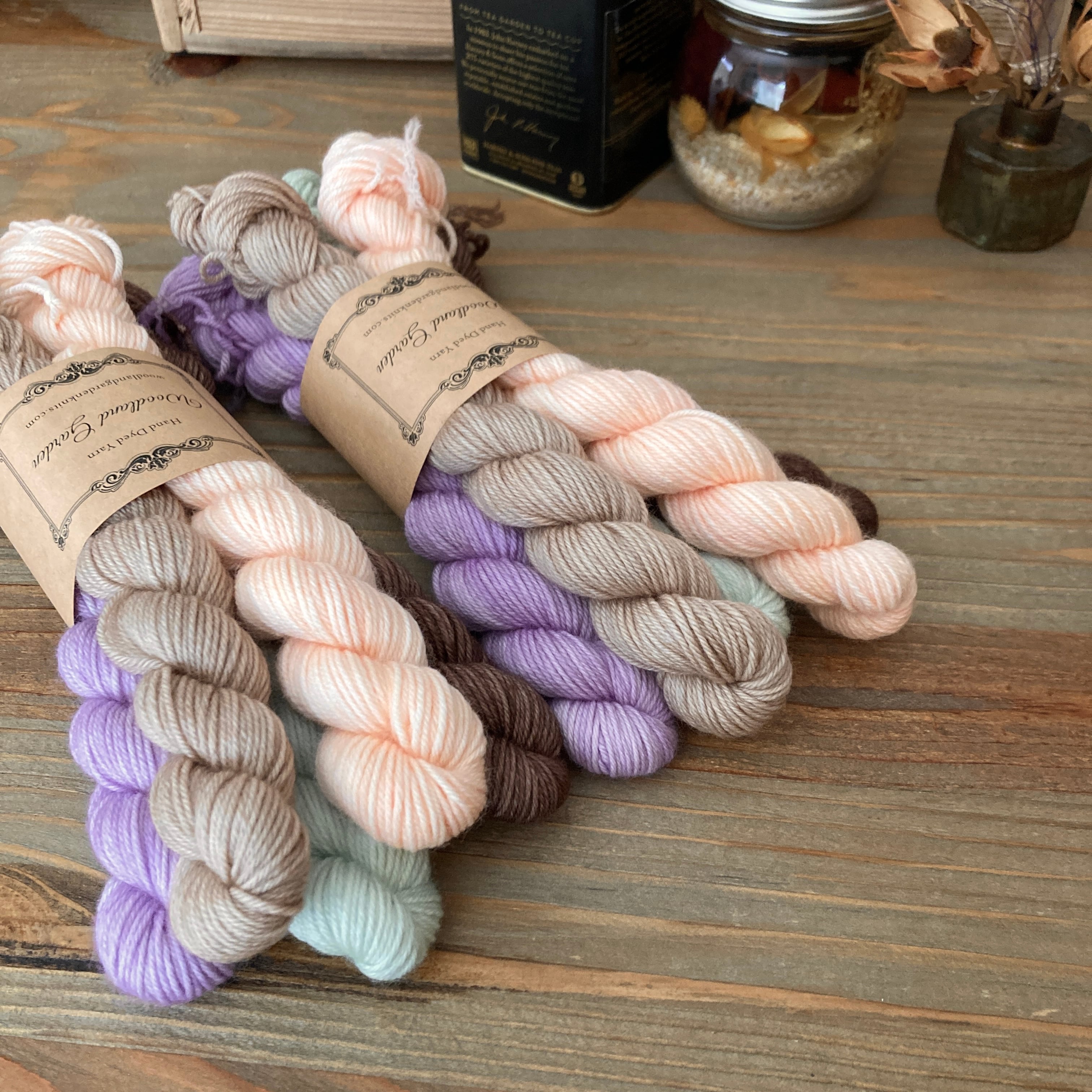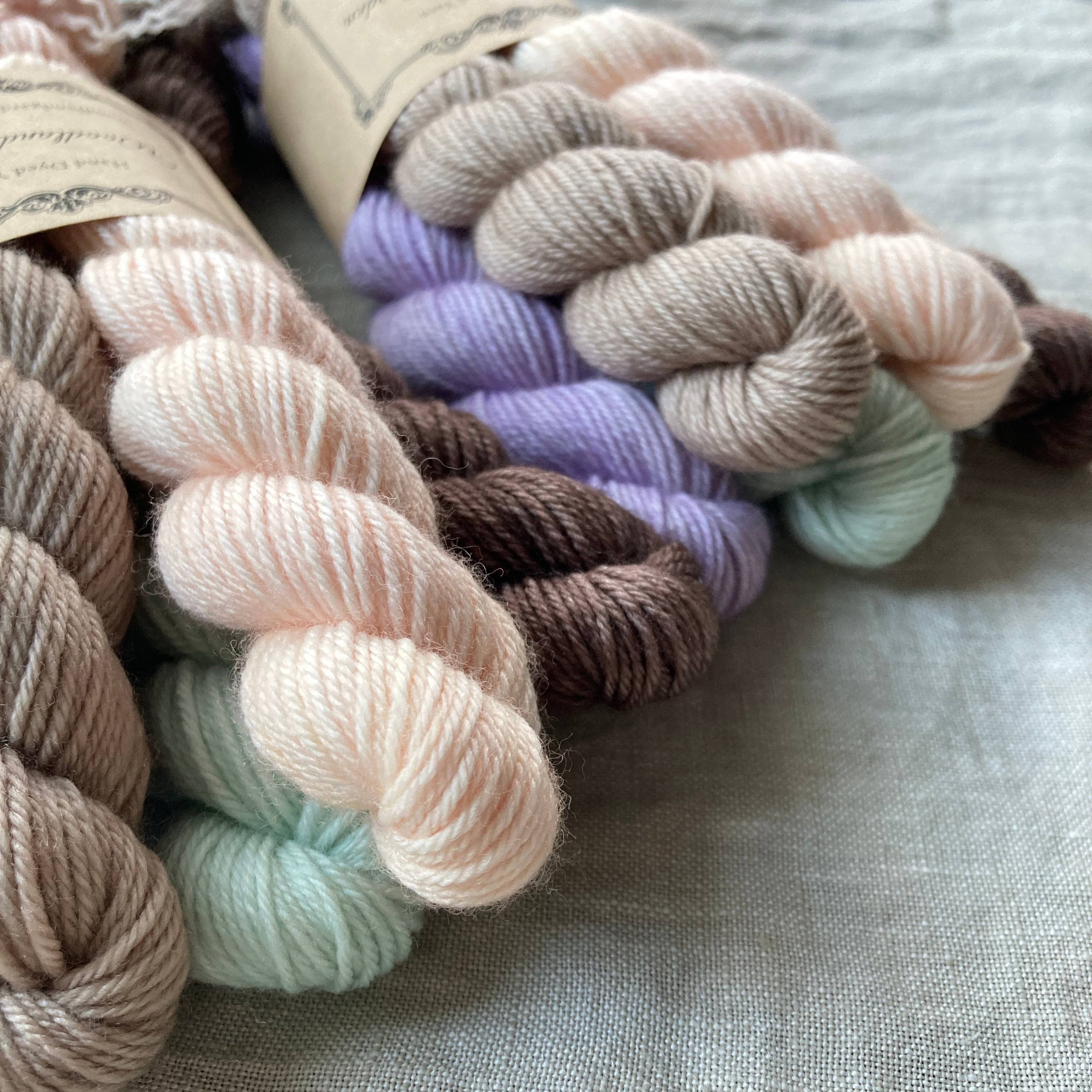 古都京都をイメージした淡めカラーのセット。さくらのピンク、雅なパープル、疏水や柳のグリーン、お寺や町家のベージュ&ブラウン。ぜんぶ使ってランダムボーダーの靴下とか可愛いに違いない!と想像して染めました。淡めカラー好きさんはぜひ⭐︎